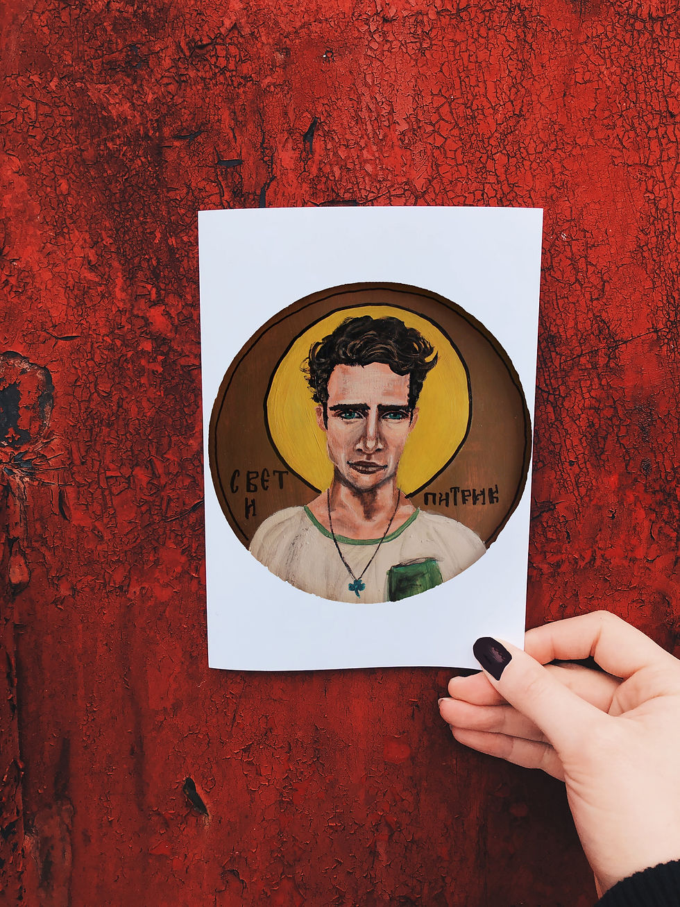 Patrick wears simple clothing to accommodate for his long, perilous journeys and consistent traveling. He wears a shamrock to symbolize the Trinity, and wears the green of the country he came to love and call home. He has a determined expression, but it is softened with patience and understanding.