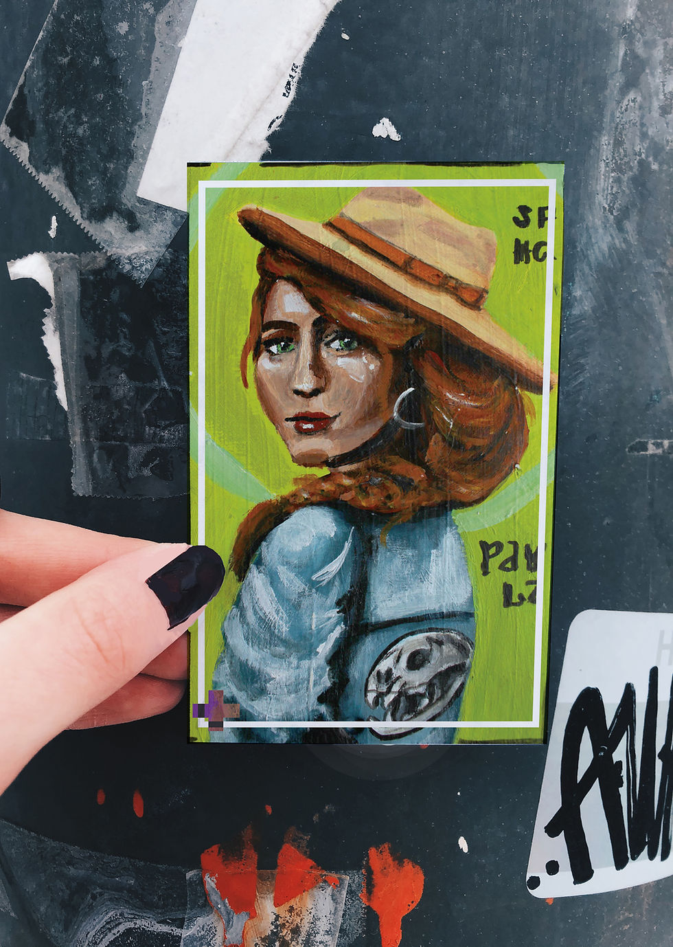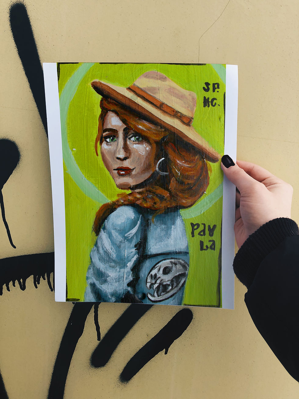 The credit for the genius idea of combining St. Jerome's symbols of the lion and skull by using a lion's skull on her jacket has to go to the person who commissioned this piece. Paula also wears a "desert hat" and an expression of hope.