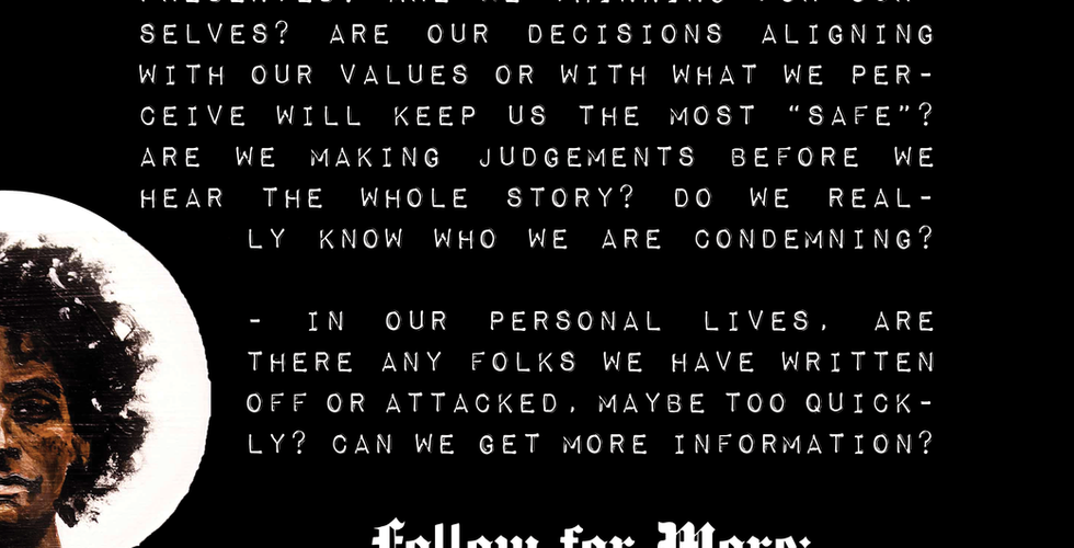 - How have we been complicit in contributing to the anger or fear as part of a group, before? have we been able to truly listen to what is being presented? Are we thinking for ourselves? Are our decisions aligning with our values or with what we perceive will keep us the most “safe”? Are we making judgements before we hear the whole story? Do we really know who we are condemning?